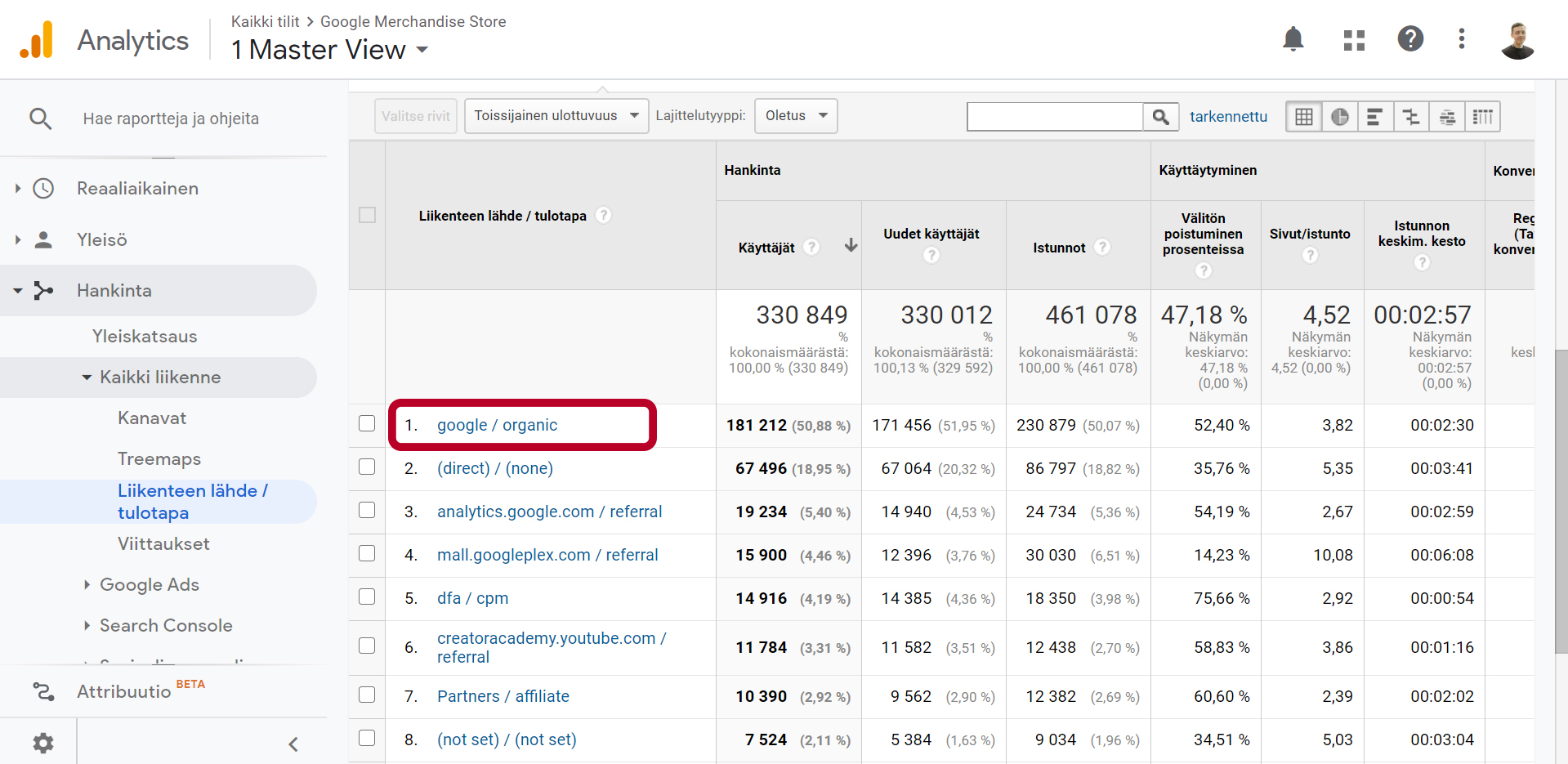 Mikäli haluat tätä tasoa tarkempaa tietoa, mistä vierailijoita verkkosivustollesi saapuu, ”Liikenteen lähde / tulotapa”-raportti on erinomainen raportti siihen tarkoitukseen. Raportin löydät kohdasta ”Hankinta > Kaikki liikenne > Liikenteen lähde / tulotapa”. Kyseisestä raportista voit lukea kirjaimellisesti liikenteen lähteen, eli mistä käyttäjä saapui, esim. ”Google” tai ”Facebook” ja tulotavan, eli miten käyttäjä saapui, esim. ”organic” tai ”referral”. Kun muuttujana on ”Google / organic”, on kyseinen käyttäjä tullut Googlen orgaanisen hakutuloksen kautta. Tämä perusraportti siis tarjoaa hyvinkin tarkasti tietoa käyttäjän hankinnasta.