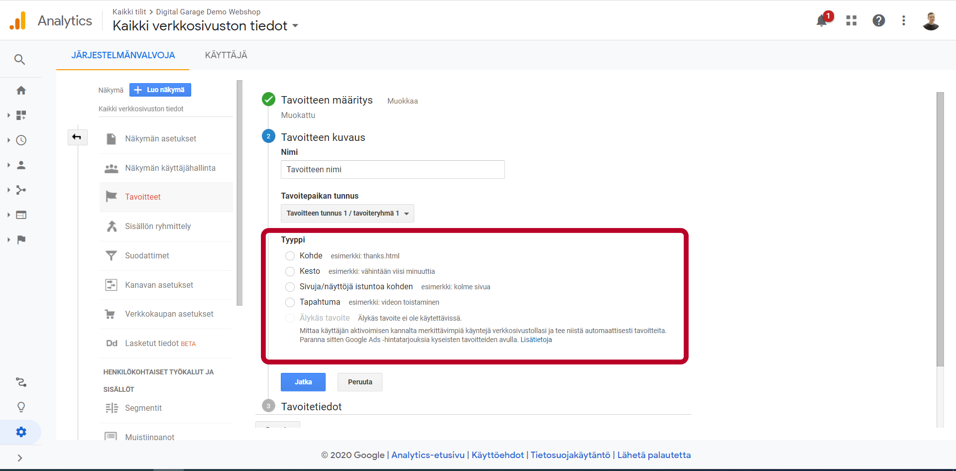 Google Analyticsin tavoitteen luomisessa on valittava tavoitetyyppi, jonka mukaan määritetään tavoitteen saavuttamistapa. Kohde-tavoitetyypin avulla saat määritettyä halutun tavoitteen esimerkiksi yhdestä konkreettisesta sivusta. Tällä tavoin voit määrittää tavoitesivuksi Ota yhteyttä tai Kiitos tilauksesta -sivun, ja täten myös seurata eri raporteista, miten esimerkiksi hankintakanava, liikenteen lähde tai markkinointikanava olivat suhteessa sivuston eri tavoitteisiin, kuten yhteydenottoihin tai myyntiin.