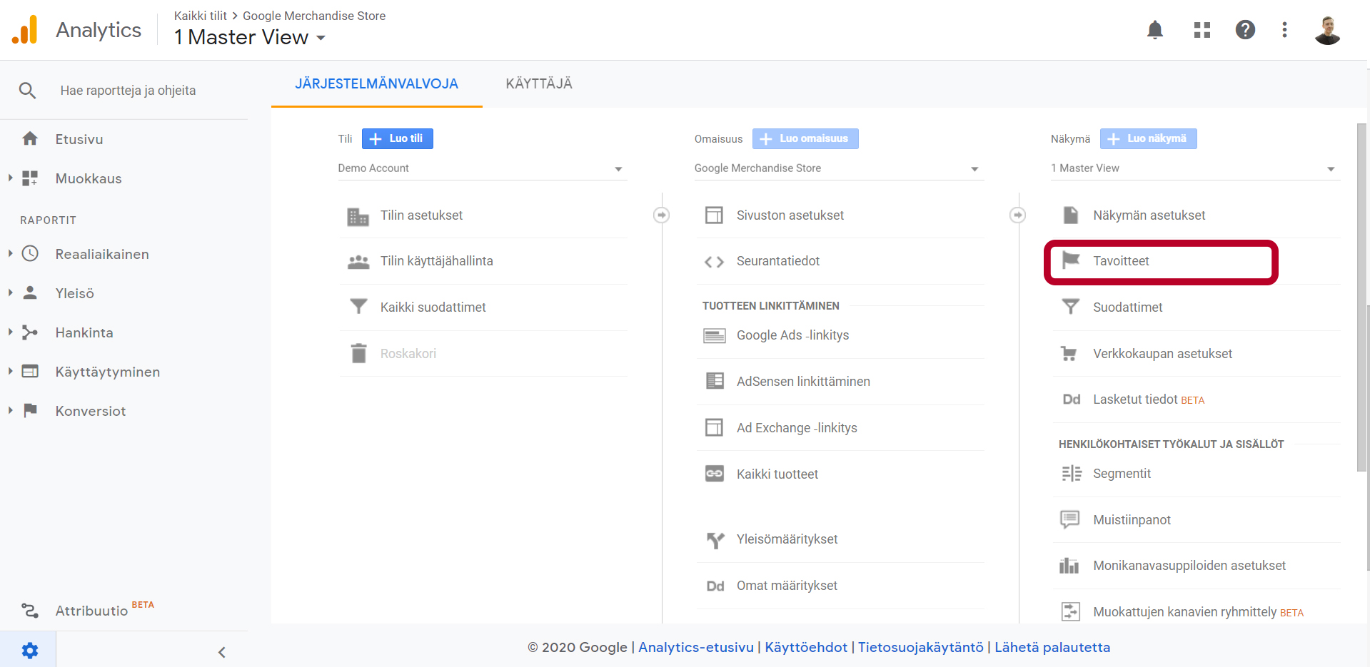 Google Analyticsissa saat helposti määritettyä mitattavia tavoitteita Järjestelmävalvoja-sivulla, johon pääsee vasemman reunan raporttinavigoinnin raporttiluettelon alapuolella olevasta painikkeesta. Analyticsissä voi Näkymä-tasolla määrittää mitattavia tavoitteita eri tavoitetyyppien avulla.