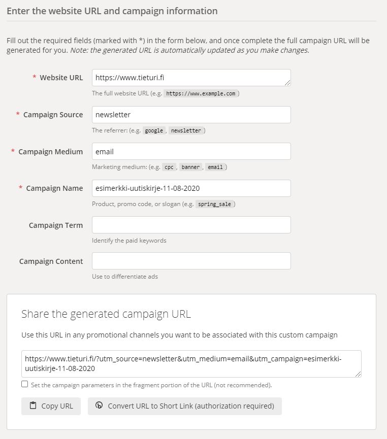 Alapuolella olevassa kuvassa on esimerkki Googlen Campaign URL Builder -työkalulla tehdystä url-osoitteesta, jossa on mitattavia UTM-parametreja. Esimerkissä on muodostettu url-osoite, jonka avulla saadaan mitattua 11. elokuuta 2020 lähetetystä uutiskirjeestä tulevaa liikennettä Tieturin etusivulle. Url-osoite ohjaa osoitteeseen https://www.tieturi.fi, liikenteen lähteeksi on määritetty newsletter ja tulotapa on email. Lisäksi kampanja on nimetty lähetetyn uutiskirjeen nimen sekä päivämäärän mukaan. Työkalun muodostamassa url-osoitteessa näkyvät työkalulla määritetyt parametrit osoitteen lopussa: