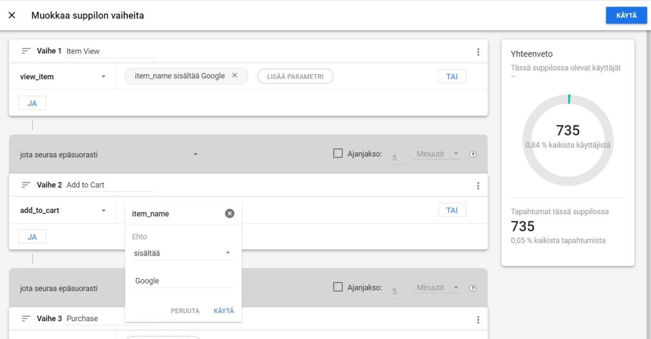 Yllä olevassa esimerkissä näkyy lisätty ehto tapahtuman parametreissä. Ehdoksi on määritetty ”item_name sisältää Google”, jonka avulla vaiheessa mitataan vain niitä tapahtumia, joiden tuotenimessä esiintyy sana Google. Tällä tavoin pystyy tarkimmillaan määrittämään tuotteen tarkkuudella mitattavan vaiheen.