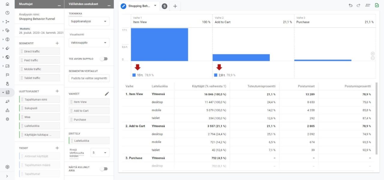 Yllä olevassa esimerkissä on luotu suppiloanalyysi, jonka avulla pystyy muun muassa hahmottamaan käyttäjien toiminnan eri vaiheet esimerkiksi konversiopolussa ja tunnistamaan vaiheiden toimivuuden tai vaiheet, jossa ilmenee ongelmia. Suppiloanalyysin avulla pystyy täten tunnistamaan esimerkiksi oman sivuston konversiopolun pullonkaulat. Tässä esimerkkianalyysissä on tutkittu verkkokaupan ostokäyttäytymistä tuotteen katselusta ostoon asti, kun analyysin vaiheiksi on määritetty tapahtumat Item view, Add to Cart ja Purchase. Kun nämä vaiheet ovat määritetty, analyysissä pystymme tutkimaan kaikkia sivustolla tapahtuvia tuotteiden katseluita, ostoskoriin lisäämisiä sekä ostoja.
