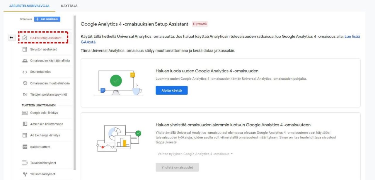 Analyysien käyttäminen maksuttomasti onnistuu Google Analytics 4 -omaisuuksissa. GA4:n saa otettua sivustolle helposti käyttöön ja suosituksena tällä hetkellä onkin datan rinnakkainen kerääminen sekä Universal Analyticsiin että GA4:ään. Universal Analytics -käyttäjille Järjestelmävalvoja-ikkunassa Omaisuuden asetuksissa on GA4:n Setup Assistant, jonka avulla asennuksen saa tehtyä muutamalla painalluksella.