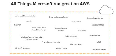 AWS tarjoaa Lambdan, Glacierin ja muiden palvelujen lisäksi myös oivallisen alusta Microsoft työkuormien (workloads) ajo-alustaksi. Esimerkiksi alla olevasta kuvasta käy ilmi, mitä työkuormia AWS:n tarjoamassa IaaS (Infrastructure As A Service) alustalla voisi ajaa: