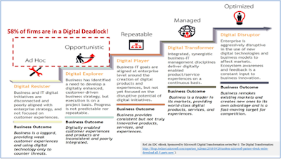 Digimurros on asia, josta toitotetaan, mutta mikä on digitaalinen umpikuja (engl. Digital Deadlock)? IDC -konsulttiyrityksen tutkimus digimurrosten etenemisestä 1 500:ssa yrityksessä eri puolilta maailmaa osoitti, että 58 % yrityksistä on ns. digitaalisessa umpikujassa (ks. kuva alla).