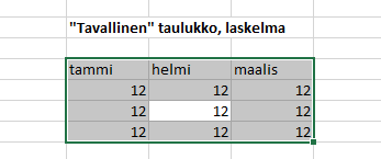 Tee ensin itsellesi muutaman solun taulukko, jossa on jotain tietoja. Valitse solualue, esimerkiksi 4 x 4 solua (tai 3 x 5 tai joku vastaava), kirjoita jokin tieto ja hyväksy painamalla Ctrl + Enter. Kirjoittamasi tieto hyväksytään jokaiseen valitsemaasi soluun. Tämä on nopea tapa tehdä pieni testitaulukko, tosin samalla tiedolla.