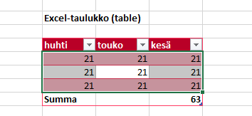 Paina tavallisessa taulukossa Ctrl + A uudestaan, jolloin seuraavaksi valitaan koko laskentataulukko (Sheet). Excel-taulukossa valitaan tietoalueen lisäksi taulukon muut osat ja kolmas Ctrl + A valitsee koko laskentataulukon (Sheetin).