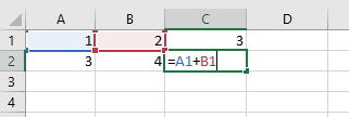 Jos haluat kopioida kaavan sellaisenaan, ilman, että viittaukset muuttuvat, paina kaavan alapuolella olevassa solussa (kuvassa C2) Ctrl + ’ (heittomerkki ä:n oikealla puolella) ja hyväksy Enterillä. Silloin solussa C1 oleva kaava =A1+A2 kopioituu soluun C2 samanlaisena eli =A1+A2.