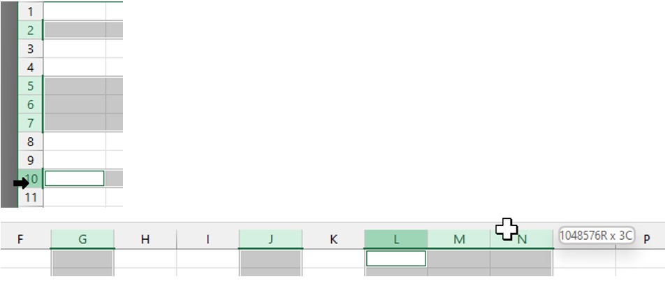 Voit myös napsauttaa ensimmäistä tarvittavaa riviä tai saraketta, painaa Vaihto- eli Shift-näppäimen pohjaan ja napsauttaa viimeistä tarvittavaa riviä tai saraketta, jolloin nämä ja niiden välissä olevat rivit tai sarakkeet valitaan.