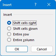 Valitse avautuvasta ikkunasta mitä haluat lisätä. Siirretäänkö valitut solut oikealle vai alas, jolloin niiden kohdalle lisätään uusia soluja. Voit myös valita lisätäänkö valittujen solujen korkeudelta uusia rivejä, jolloin alle jäävät rivit työnnetään alas, vai solujen leveydeltä uusia sarakkeita, jolloin alle jäävät sarakkeet työnnetään oikealle.