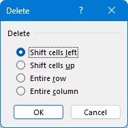 Valitse avautuvasta ikkunasta mitä haluat poistaa. Poistetaanko valitut solut niin, että korvaavat solut siirretään oikealta vasemmalta tai alhaalta ylös. Voit myös valita poistetaanko valittujen solujen korkeudelta rivejä, jolloin korvaavat rivit siirretään alhaalta ylös, vai poistetaanko solujen leveydeltä sarakkeita, jolloin korvaavat sarakkeet siirretään oikealta vasemmalle.