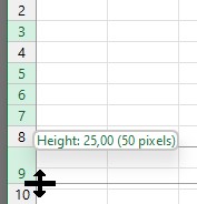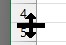 Jos vedät hiirellä rivillä ylemmästä viivasta, muutat ylemmän rivin korkeutta (ylempi kuva). Jos vedät hiirellä rivillä alemmasta viivasta (alempi kuva), vedät esiin piilossa olevaa riviä.
