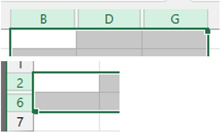 Ylemmässä kuvassa on valittuna sarakkeet B–G, kun välissä olevat sarakkeet C ja E–F ovat piilossa. Huomaa B:n ja D:n reunaviiva näkyy kaksoisviivana. Alemmassa kuvassa on valittuna rivit 2–6, kun välissä olevat rivit 3–5 ovat piilossa. Huomaa rivien välinen reunaviiva, joka näkyy kaksoisviivana. Napsauta hiiren kakkospainikkeella valinnan päällä ja valitse Näytä (Unhide).Rivien tai sarakkeiden välissä oleva kaksoisviiva kertoo, että taulukossa on piilotettuna yksi tai useampi rivi tai sarake.