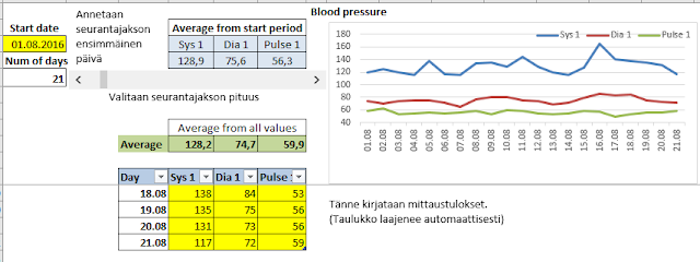 Kirjoiteltuani aikani tuloksia paperilappusille, jotka aina olivat väärässä paikassa eivätkä koskaan käsillä, kun niitä tarvitsin, päädyin tekemään taulukon Exceliin. Perustaulukon tekeminen ei ollut kovin vaikeata. Sitten keksin tallentaa sen pilvipalveluun, jolloin se oli siellä missä minäkin: kännykällä selattavissa vaikka lääkärin vastaanotolla.