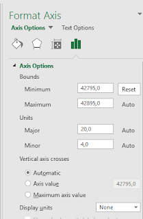 To create the above chart, I used a simple stacked bar chart and made one data series invisible (fill none, border no border). Then I formatted the x-axis as date. The challenge here is the date format. The x-axis uses date serial numbers, and I wanted to start my chart at a specific date. To get the correct serial number for the date, I typed the start day in an Excel cell with general number format. In this case, the serial number was 42795. I then copied the serial number to the Format Axis minimum box.