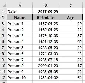 Åldern i C-kolumnen har beräknats med funktionen DATEDIF enligt följande: =DATEDIF(B3;$B$1;”y”)