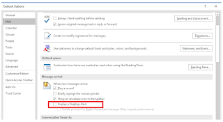 Tiedosto – Asetukset – Sähköposti – Viestin Saapuminen ja poista merkintä kohdasta Näytä työpöytäilmoitus.