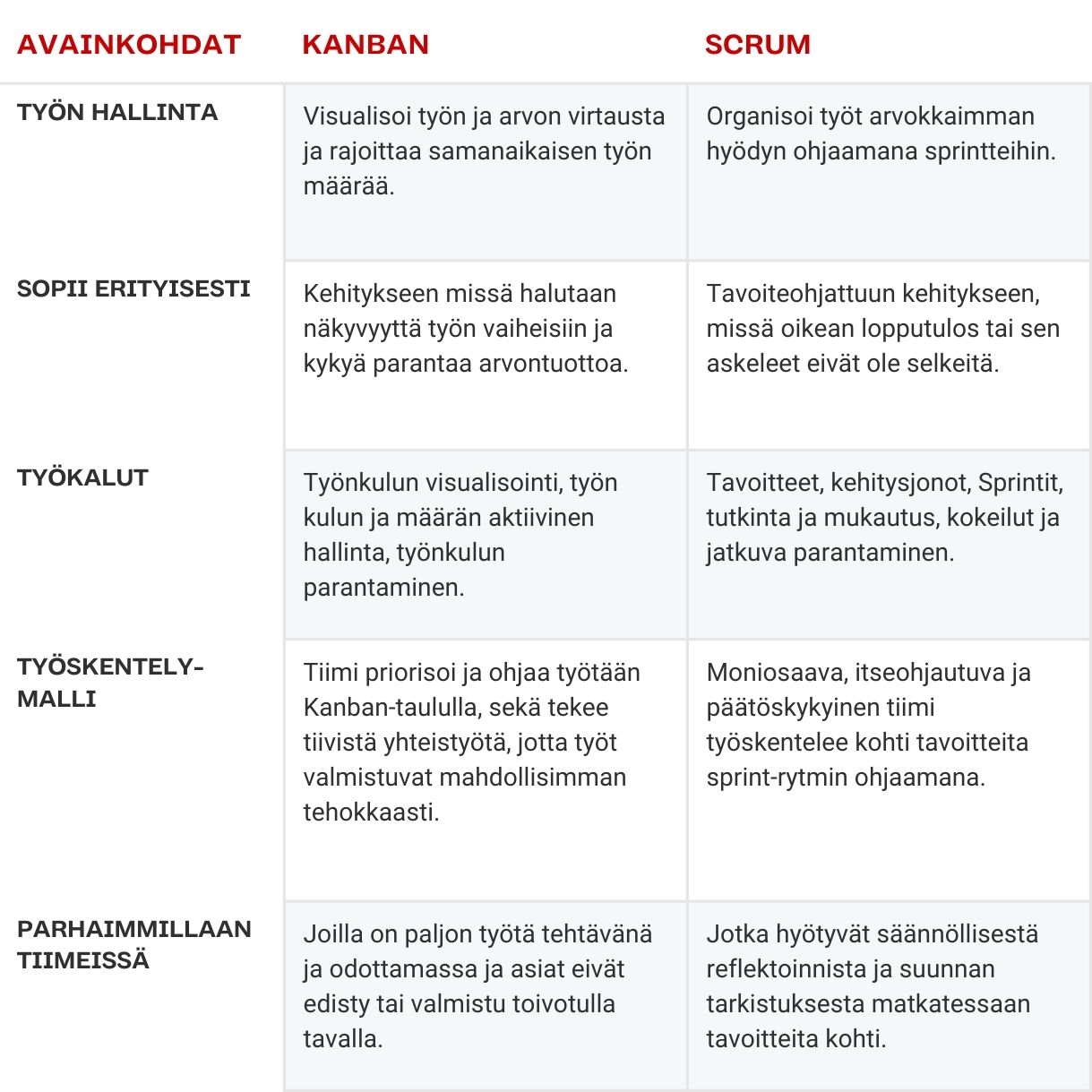 Kanbanin ja Scrumin välillä valinta riippuu pitkälti työn luonteesta, tiimille sopivasta toimintatavasta sekä organisaation ja projektin tavoitteista.