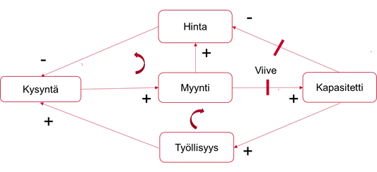 Esimerkkikaaviosta käy ilmi, että myyntimme kasvaa kysynnän kasvaessa ja kysyntä vähenee hinnan noustessa. Kaaviossa on vahvistavia ja tasapainottavia silmukoita, jotka toimivat samoihin tai vastakkaisiin suuntiin. Myynnin ja kapasiteetin välinen viive johtaa niiden väliseen epälineaariseen suhteeseen.