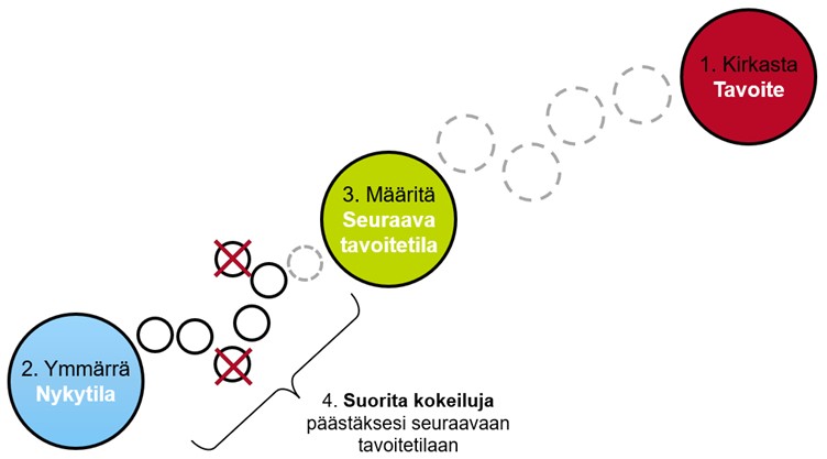 Kun suunta on kirkas ja oletukset tarvittavista askelmerkeistä on luotu, on viimein aika kääriä hihat ja ryhtyä töihin. On kannattavaa suosia työskentelymenetelmiä, jotka ovat luontaisesti tavoitelähtöisiä ja mahdollistavat tarkastelun ja oppimisen matkan varrella.