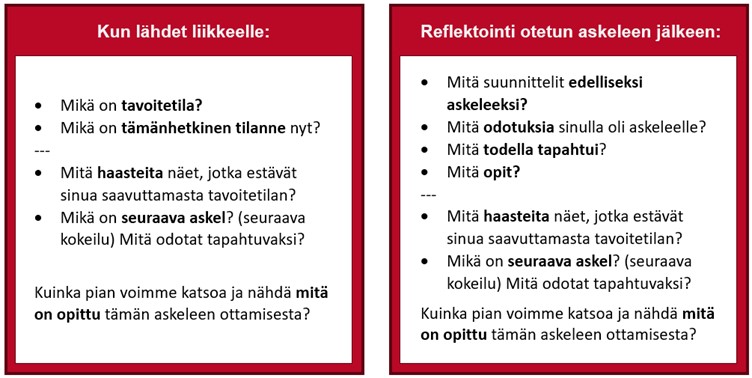 Valmennuskatan 5 kysymystä mahdollistavat reflektion ja pysähtymisen, sillä kukaan ei voi aidosti etukäteen tietää mikä lopputulos otetuilla askeleilla on ja saman haasteen tai välitavoitteen äärellä saattaa joutua työskentelemään usean kokeilun ajan.