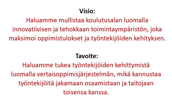 Visio on termi, jota käytetään usein tekemisen suunnannäyttäjänä, mutta vaikka se parhaimmillaan onkin selkeä ja inspiroiva sekä saa ihmiset motivoitumaan työskentelemään yhdessä, saattaa nykyhetken ja vision väliin mahtua valtameri eikä kenelläkään oikein ole käsitystä mitä askelia pitäisi ottaa maaliin päästäkseen.