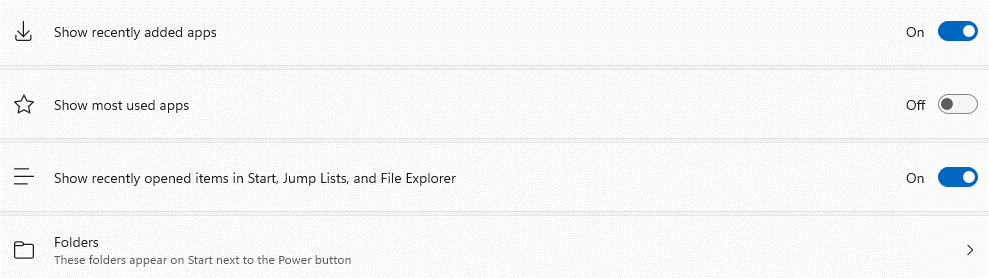 Mukauttaminen – Aloitus (Personalisation – Start) -asetuksissa voit valita mm. näytetäänkö viimeksi lisätyt sovellukset (recently added), eniten käytetyt (most used) sovellukset ja viimeksi avatut (recently opened) kohteet. Lisäksi voit valita mitkä Kansiot (Folders) näytetään Virtapainikkeen (Power) vieressä.