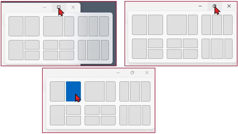 Kummassakin tilanteessa Windows näyttää erilaisia valintoja avoinna olevien ikkunoiden kohdistamiseen. Napsauta haluamaasi vaihtoehtoa (kuva oikealla) ja ikkunasi kohdistuu napsauttamaasi kohtaan näytöllä. Näytön vapaassa tilassa näytetään muut avoinna olevat ikkunat, joista voit napsauttaa ikkunaa, jonka haluat kohdistaa vapaaseen paikkaan. Jos valitset vaihtoehdon, jossa on enemmän kuin kaksi ikkunaa, jokainen vapaa paikka tarjoaa ikkunoita kohdistettavaksi, kunnes paikat on täytetty ja valitut ikkunat in kohdistettu.