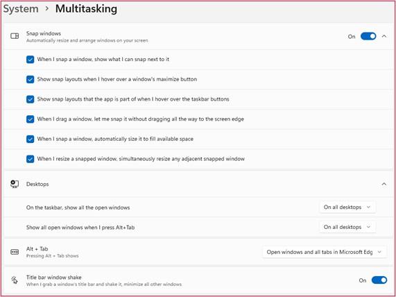 Siirry Windowsin asetuksiin, paina Win + I ja valitse Järjestelmä → Moniajo (System → Multitasking). Avautuvassa näkymässä on valintoja, joita voit laajentaa, ja tehdä sopivat valinnat. Voit sammuttaa Kohdista ikkunat (Snap Windows) -toiminnon tai valita sen alta yksittäisiä valintoja, esimerkiksi tämä uusi toiminto on toisena Näytä kohdistusasettelut… (Show snap layouts when…).