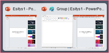 Kuvassa yllä hiiri on viety Tehtäväpalkissa PowerPoint-kuvakkeen päälle, jolloin kuva näyttää vasemmalla puolella yksittäisen PowerPoint-esityksen (vain yksi esitys on avoinna) ja oikealla puolella järjestetyn ryhmän, jossa ovat samainen PowerPoint-esitys ja Paint-ohjelma.