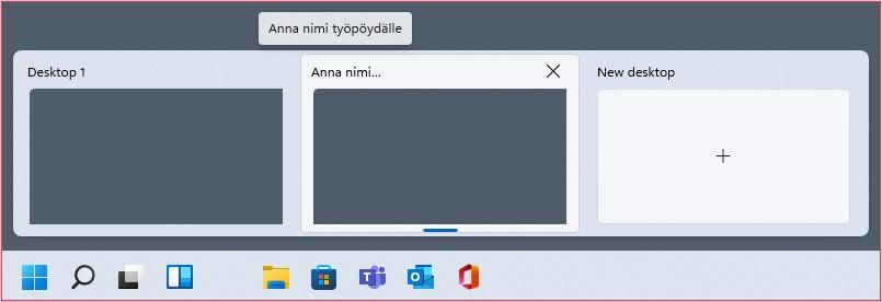 Virtuaaliset työpöydät ovat nyt lyhyesti vain Työpöytä (Desktop) (kuvassa alla kolmas kuvake vasemmalta), jolla voit lisätä Windowsiin uusia työpöytiä, joissa käytät ohjelmia. Näin yksi työpöytä ei täyty liiaksi. Kirjoita uudelle työpöydälle nimi (kuvassa Anna nimi työpöydälle), siirry työpöydälle ja avaa tarvitsemasi ohjelmat. Työpöydät säilyvät Windowsin uudelleenkäynnistyksessä, mutta eivät niiden ohjelmat tai tiedostot, joten muista tallentaa tiedot.
