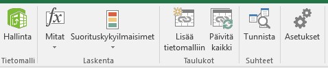 Rakensin PowerPivotiin Mittarit (Measure) ja Suorituskykyilmaisimet (KPI).