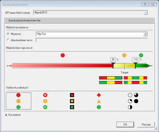 Seuraavaksi siirryin määrittelemään valintanauhalta Suorityskykyilmaisimet (KPI). Valintaikkunassa määrittelin vain mitan nimen (Measure) ja raja-arvot.