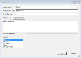 Valintanauhalta valitsin ensin Mitat (Measure), jossa määrittelin kunkin taulun summattavat kentät.
