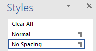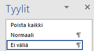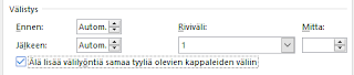 Normaali-tyylin Välistys-osion Jälkeen-ja Riviväli-arvot ovat vaihdelleet eri versioissa. Tässä on kuva versiosta 2016.