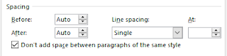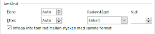 Ruotsinkielisestä versiosta selviää, että kappaleiden väliin jää tyhjä rivi. Oikeasti kappaleiden välissä voi olla toinen kappale (tai joku objekti). Tässä tarkoitetaan, että jos laitat Ennen/Jälkeen -valintaan Auto, samanlaisten peräkkäisten kappaleiden alkuun tai loppuun ei lisätä automaattista tyhjää riviä, jos olet valinnut Älä lisää.
