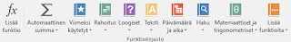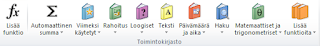 Tässä on myös sama sana käännetty eri tavalla. Insert Function on Lisää funktio, mutta Function Library oli kauan Toimintokirjasto. Kuva versiosta 2010.