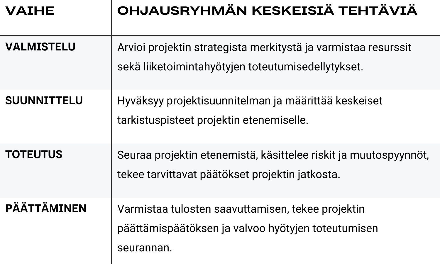 Ohjausryhmä osallistuu projektin eri vaiheisiin erityyppisin vastuutehtävin. Alla käymme läpi, miten ohjausryhmä toimii eri projektivaiheissa ja mikä sen rooli on kussakin vaiheessa.