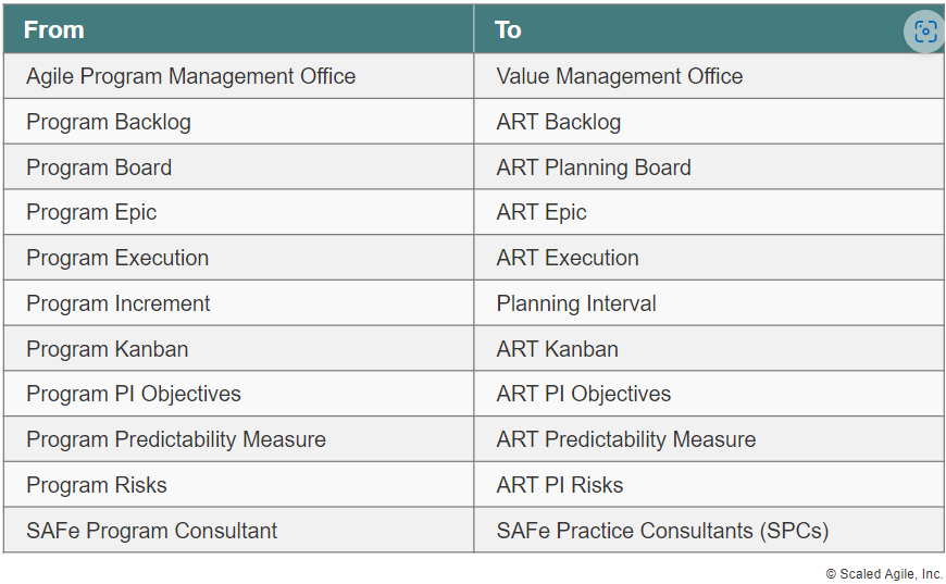 Ehkä merkitykseltään vähäisin muutos ketteryyden näkökulmasta, mutta yksi suurimmista totuteltavista asioista erityisesti SAFen kanssa pitkään työskennelleille: Program-termin poistuminen. Edellisessä SAFen versiossa poistettiin viitekehyksessä siihen asti olleet erilliset hanke- ja tiimitasot, sillä kumpikin olivat olennainen osa SAFea eikä toista ollut ilman toista. Viitekehykseen jäi tuolloin kuitenkin paljon termejä käyttöön, joissa Program-sana oli edelleen mukana. Nyt tasojen yhdistämisestä alkanut muutos on viety SAFe 6.0:ssa päätökseen ja viitekehyksessä ei puhuta enää hankkeen kehitysjonosta, hankkeen inkrementistä tai sertifioidusta SAFe hankkeen konsultista, vaan junan kehitysjonosta, suunnittelusyklistä sekä SAFe käytäntöjen konsultista.