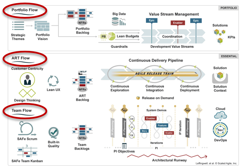 Edellä oli jo kuvattuna Lean-ajattelumallin vahvistaminen SAFen perustaan, kuin myös arvovirtojen tärkeyden kirkastaminen. Leanin periaatteet näkyvät kuitenkin myös yhdessä ehkä SAFe 6.0:n suurimmassa teemassa: Arvon virtauksen mahdollistamisessa. Sen lisäksi, että perustassa kirkastettiin SAFen omaa kuudetta periaatetta, on uudistetussa isossa kuvassa nostettu selkeästi esiin virtauksen tärkeys kaikilla tekemisen tasoilla. Miten arvo virtaa asiakkaan polussa läpi arvovirran? Miten arvon kehittäminen eli itse työ virtaa läpi ketterien julkaisujunien ja tiimien? Miten operatiivisesti tärkeät isot kokonaisuudet edistyvät ja virtaavat Portfoliotasolla? Kaikissa näissä on tavoitteena luoda kitkaton arvontuotto, minkä vuoksi jokaisen SAFen viitekehyksessä toimivan on aktiivisesti tehtävä työtä arvontuoton virtauksen hidasteiden poistamiseksi.