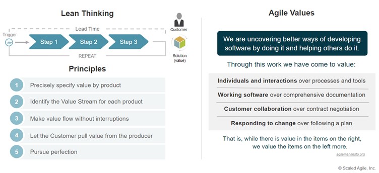 SAFen ketterää ajattelutapaa kuvaa Lean ajattelun periaatteet sekä ketteryyden arvot. Lean-ajattelussa tavoitteena on mahdollistaa nopea arvontuotto asiakkaalle turhaa työtä ja hidasteita vähentämällä sekä jatkuva parantaminen täydellisyyttä tavoittelemalla. Ketteryyden ytimessä on ihmisten välinen vuorovaikutus ja yhteistyö, valmiit arvokkaat lopputulokset sekä kyky vastata muutoksiin.