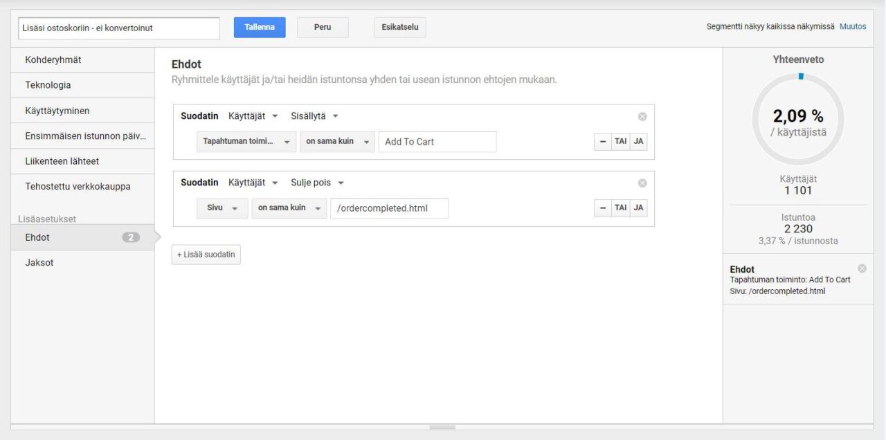Ehtoja pystyy määrittämään segmentin suodattimeksi segmentit Lisäasetukset > Ehdot -kohdassa. Esimerkkinä Google Merchandise Store, jonka dataan pääsee Analytics-demotilin avulla. Kyseisellä Analytics-tilillä mitataan tapahtuman (Add to Cart) avulla, kun henkilö lisää tuotteen ostoskoriin. Tapahtuman toteutumista voi käyttää ehtona segmentin suodattimessa. Lisäksi toisena ehtona on, ettei henkilö ole päätynyt kyseisen verkkokaupan tilausvahvistus-sivulle (/ordercompleted.html):