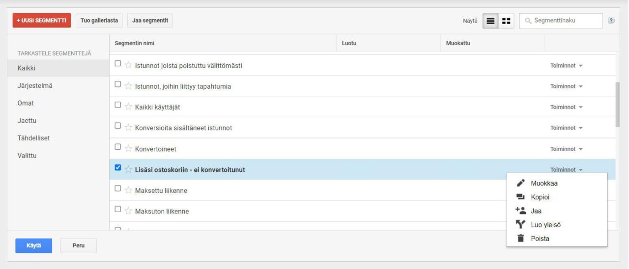 Segmenttiluettelossa pääset segmenttikohtaisesti luomaan segmentistä yleisön valitsemalla halutun segmentin kohdalla Toiminnot > Luo yleisö.