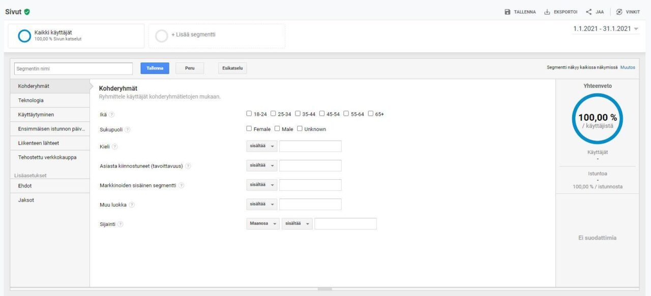 Kun segmenttiin on lisätty halutut suodattimet, rakennustyökalun oikeassa reunassa näkyy Yhteenveto-ruutu, jossa pystyt esikatselemaan, kuinka monta käyttäjää ja istuntoa luotuun segmenttiin sisällytetään ajanjaksossa, joka raportissa on valittuna. Kun segmentti on valmis ja pitää sisällään halutun datan, rakennustyökalun yläkulmasta pääsee segmentin tallentamaan Tallenna-napista. Luotu segmentti jää talteen segmentin luoneelle henkilölle, ja on valittavissa myöhemmin segmenttiluettelosta.