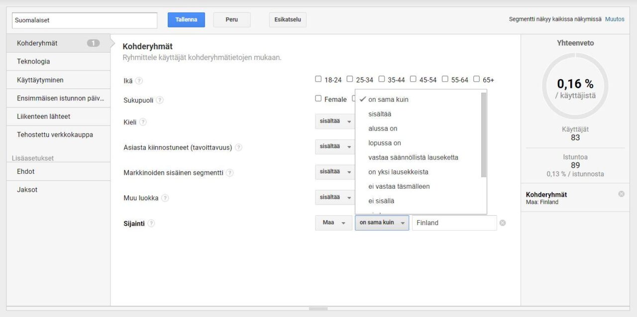 Esimerkiksi jos halutaan luoda segmentti suomalaisista käyttäjistä, valitaan ulottuvuudeksi Maa, operaattoriksi ”on sama kuin” ja ulottuvuuden arvoksi ”Finland”. Jos operaattoriksi vaihtaa ”ei vastaa täsmälleen”, on segmentissä kaikki muut kuin suomalaiset käyttäjät.