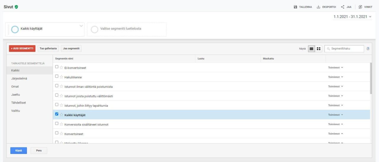 Voit käyttää raporteissasi segmenttejä, ilman niiden erillistä luomista! Analytics pitää sisällään järjestelmän vakiosegmenttejä, eli segmenttejä, jotka ovat kaikkien työkalun käyttäjien käytettävissä. Kaikille valmiiksi olevia segmenttejä on yhteensä 22. Valmiina segmentteinä ovat muun muassa: