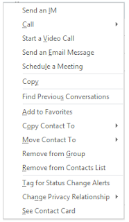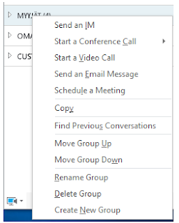 Pystyt helposti lähettämään ryhmän jäsenille mm. yhteisen pikaviestin tai sähköpostin. Kun napsautat hiiren kakkospainiketta ryhmän päällä, saat auki komentovalikon, josta löytyy mahdollisuus pikaviestin ja sähköpostin lähettämiseen. Voit myös ajoittaa kokouksen (Schedule a Meeting) ryhmän kanssa.