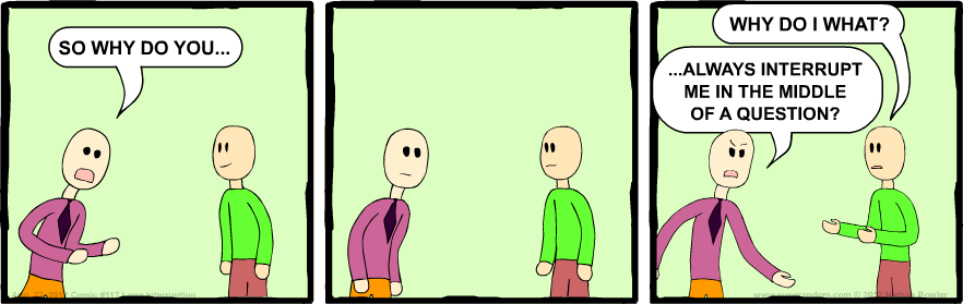 Toinen merkittävä aikasyöppö työssä on työn keskeytyminen, joko kollegoista tai ta-daa, itsestäsi johtuen. Tuntunee tutulta, että kun olet juuri päässyt flow-tilaan, työ sujuu kuin tanssi ja etenet hyvää tahtia ja ajatus virtaa (kaikki mahdolliset viestintävälineet on oikeaoppisesti suljettu, ettei vaan mikään häiritse sinua), niin joku koputtaa olallesi ja pyytelee anteeksi, että häiritsee mutta tässä olisi vaan yksi tämmöinen pikainen kysymys.