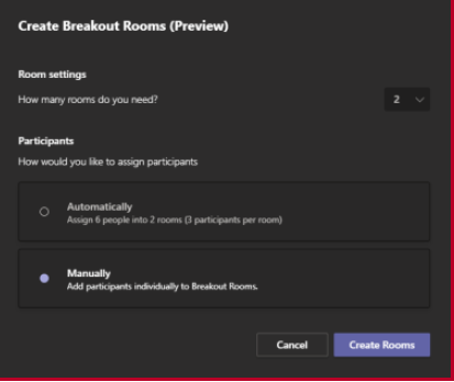 Luo pienryhmätilat-näkymässä voit määritellä, kuinka monta ryhmää luot ja valikoituvatko ryhmän jäsenet Teamsin jakamana automaattisesti vai lisäätkö heidät itse manuaalisesti.