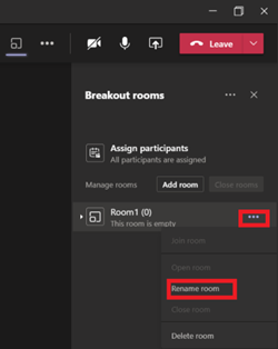 Voit poistaa huoneen napsauttamalla Suljettu(Closed)-painiketta ja Poista huone (Delete room). Huoneeseen osallistujat poistetaan huoneesta ja he palautuvat Määritä osallistujia (Assign participants)-luetteloon.